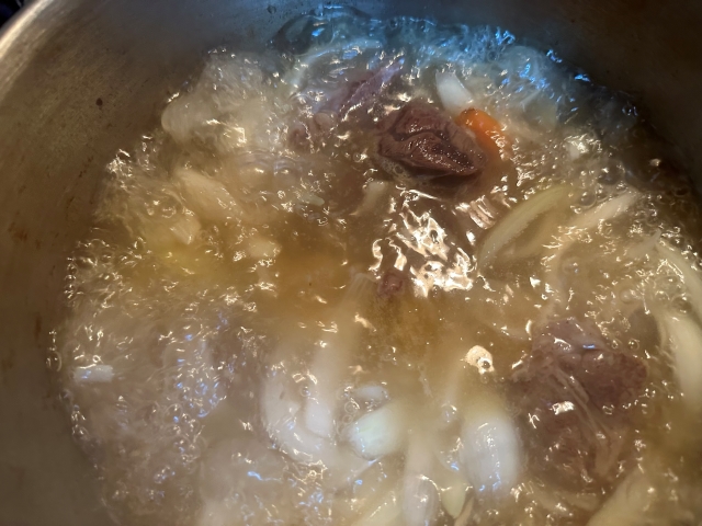 中に入る具材も似せて。辛くないグリーンカレーに挑戦。うまくいきました。もちろん、味もおいしくなるように、牛スネ肉とタマネギを煮込んでスープ作りから。